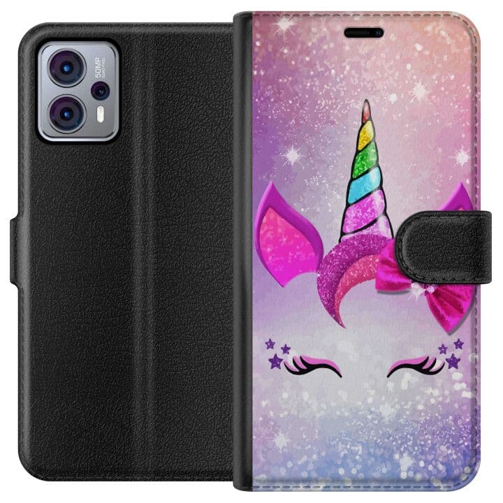 Kompatibelt Plånboksfodral till Motorola Moto G23 Minimalistiskt enhörningsansikte med regnbågshorn på rosa bakgrund