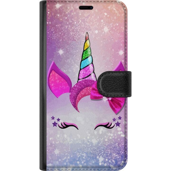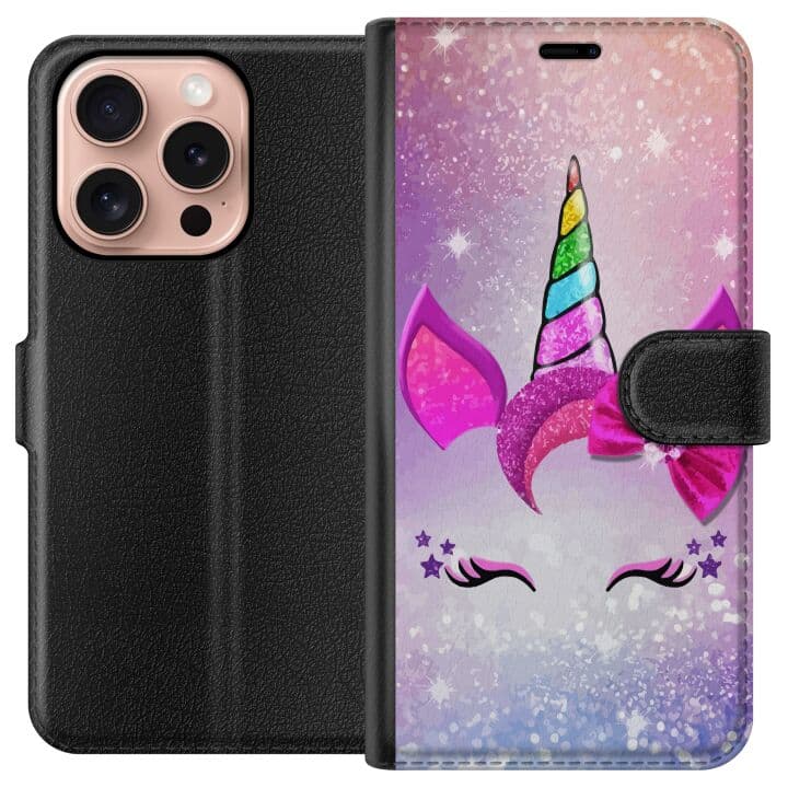 Kompatibelt Plånboksfodral till Apple iPhone 16 Pro Minimalistiskt enhörningsansikte med regnbågshorn på rosa bakgrund
