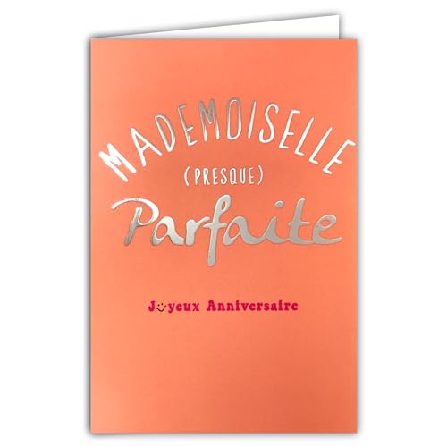 AFIE 69-9053 Glad födelsedagskort MADEMOISAL nästan perfekt glänsande silvertext på rosa bakgrund för ung flicka kvinna + kuvert 12 x 17,5 cm - franskt tillverkat tryck