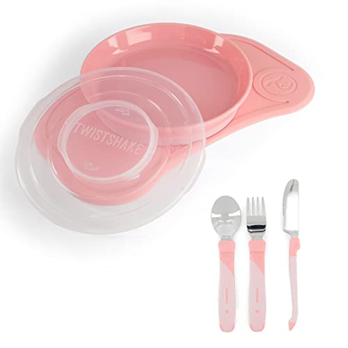 Twistshake Babyservis set - 6 Delar | 1x Baby Silikon Bordstablett - 1x Kid Tallrik - 1x Delad Tallrik - 3x Rostfritt Stål Lär dig Bestick | Babymiddagsset | Porslin för Avvänjning | 6m+ | Rosa