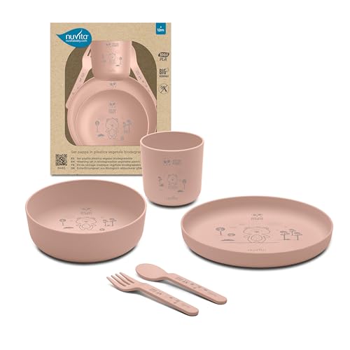 Nuvita 8465 måltidsset - tallrik, skål, kopp och bestick i PLA - diskmaskinssäker, mikrovågsugnssäker, BPA-fri och ftalatfri - från 6 månader - engelsk rosa