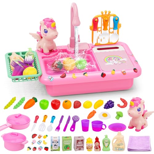 deAO Set med diskbänk i kök med elektriska kranar, barnhandfat med skärleksaker, bestick i växlande färger, vattenåtervinning, barnkökssats (rosa)