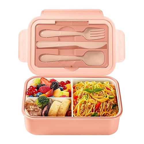 Diboniur Lunchbox, Bento lunchlåda, barn, vuxen, 1400 ml med 3 fack, läckagesäker matlåda med bestick, lämplig för mikrovågsugn i diskmaskinen, skola picknick arbete (rosa)