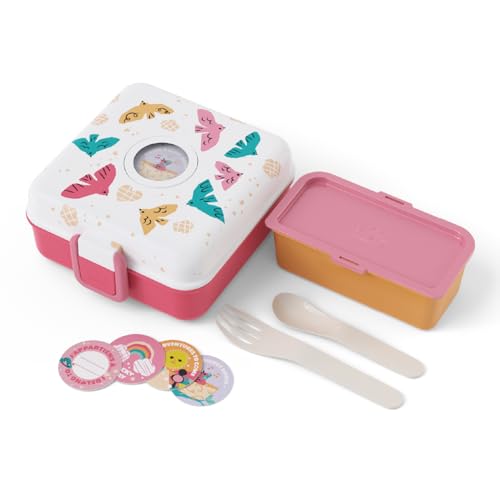 Umami Kids Lunch Box med bestick,läckagesäker,hållbar, Bento-stil,3 stora fack,idealisk storlek för portioner från 3 till 9 år, BPA-fri, säker för mikrovågsugn och diskmaskin (rosa)
