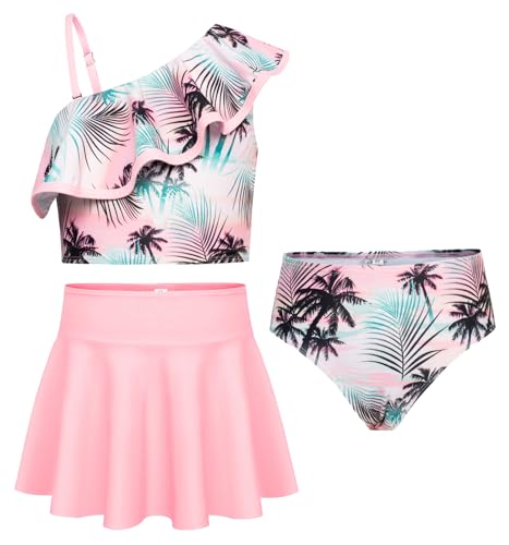 GRACE KARIN Bikini set med 3 justerbara axelremmar volanger tankini med kjol 5–12 år, Rosa palm, 7 år
