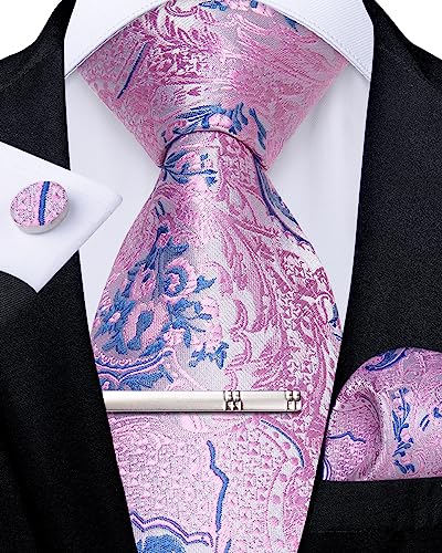 DiBanGu män slips paisley sidenslips och näsduk med manschettknappar & slipsklämma set bröllop, rosa och blå, En Storlek