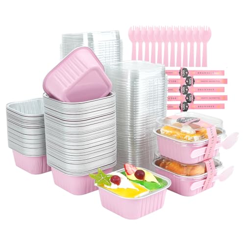 RETON 100 st fyrkantiga minikoppar med lock, 1,5 dl aluminiumfolie bakformar muffinsfoder, liten brödkaka med klistermärken och sporks, mini limpa tårtfodral för fest bröllop (rosa)