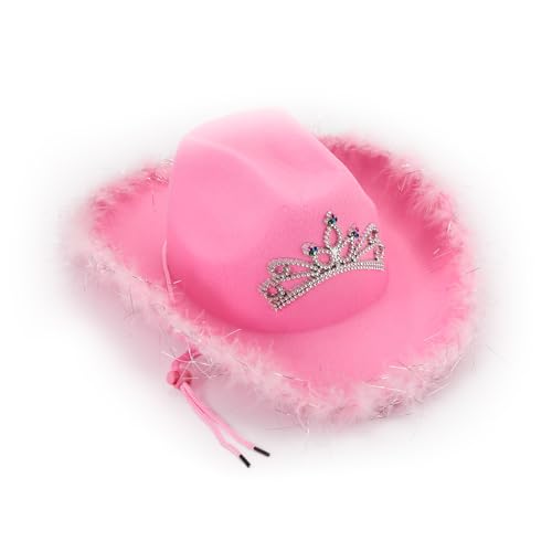 Zinkrosa cowboyhatt med tiara - One-Size-Fits-All Rosa cowgirlhatt med justerbar hakrem och fjäderklippning för fotobås, & fester, etc.