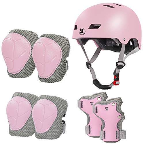 Cykelhjälm för barn med knäskydd armbågsskydd handledsskydd, justerbar hjälm för barn 5-14 år och ungdomar, sportskydd för skateboard, cykel, skoter (Rosa)