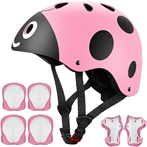 Skyddsutrustningsset för barn, 7 delar, för utomhusbruk, sporter, pojkar, flickor, cykelhjälm, säkerhetsdynor (knä-, armbågs- och handledsskydd), för sparkcykel, skateboard, cykel (A-rosa nyckelpiga)