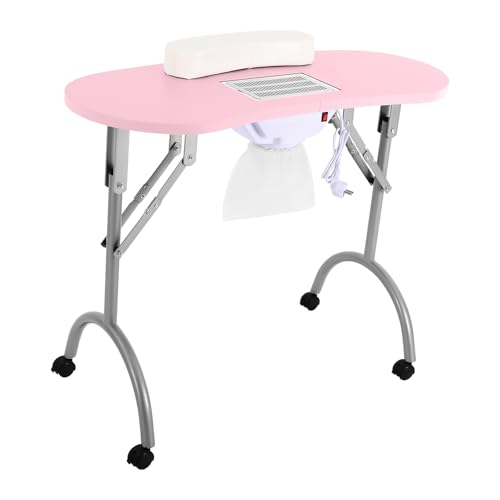 Fällbart manikyrbord, multifunktionellt nagelarbetsbord, bärbart manikyrbord med hjul, handledsstöd för kunder och dammsugare, rosa