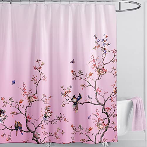 LIVETTY Rosa fågel blommigt duschdraperi 180 cm × 180 cm mögelsäkert fjärilstyg badrumsdraperi för kvinnor och män med 12 krokar tvättbara snabbtorkande gardiner