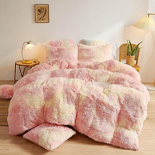 Lanqinglv Plysch påslakan 140 x 200 cm, rosa, gul, färgstarkt flanell varm vinter fluffig, sängkläder set för 1 person, plysch med stängning + 1 örngott 65 x 65 cm