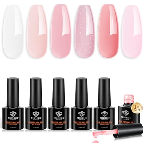 MODELONES 8-i-One Builder gel, 6 färger naken glitter rosa klar uppbyggnadsgel för gelnaglar, hård gel Builder nagelförlängning quick Extension, UV nagellack blötläggning av UV-naglar för nagelstudio