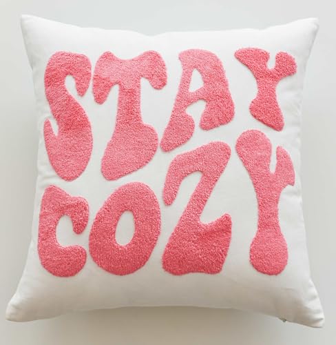 FAVDEC Broderat Stay Cozy dekorativt rosa kuddöverdrag för prydnadskudde, håll dig mysig 45 cm x 45 cm endast överdrag