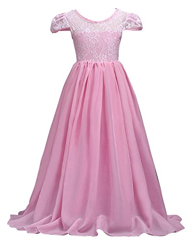 Anyu Flickor spetsklänning chiffong ärm klänning golvlängd klänning bröllop brudtärna blomma flicka lång klänning, Rosa, 160 cm