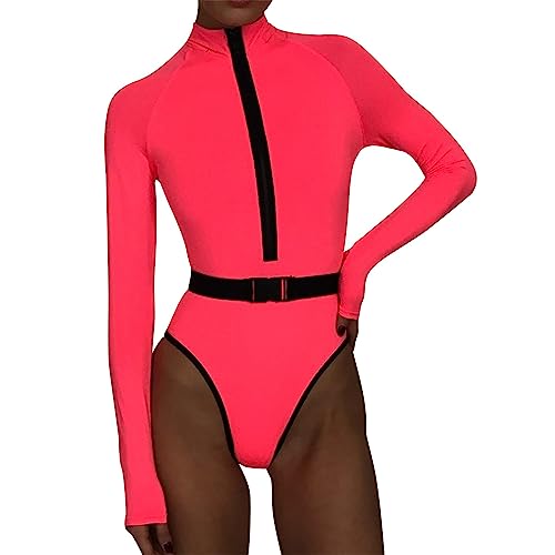Dam Rash Guard badkläder 2025 sommar baddräkt dam långärmad kostym med fluorescerande dragkedja, midjeband och godisfärg våtdräkt kortärmad vakt kvinnor beskurna, Rosa, S