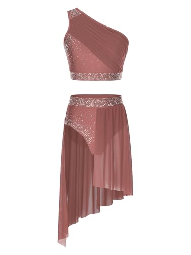 JEATHA Dam, asymmetrisk lyrisk danskostym, klänning, strass, ärmlös, crop top med danskjol, dans, outfit, gymnastikdräkt, dansklänning, konkurrens, kostym, Dämpad rosa, S