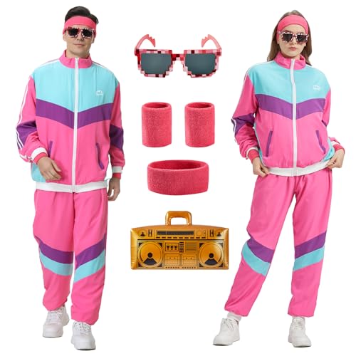 80-tals 90-tals outfit herr dam 80-tals träningsoverall jacka byxor kostym, 80-tals kostym herr med tillbehör, retro joggingdräkt, 80-tals 90-tals kostym kostym par bad knapp outfit för karneval, ROSA