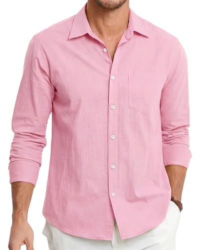 HISDERN Linneskjorta för män, långärmad skjorta, bomull, fritidsskjorta, linneskjorta, normal passform, affärsskjorta, sommarskjortor med ficka, ROSA, XL