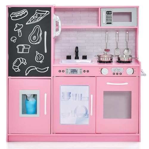 Fantaskk Leksakskök med tavla, lekkök barn med 10 lektillbehör, träkök, barnkök med ugn, mikrovågsugn och diskmaskin och glasmaskin för barn från 3 år (rosa)