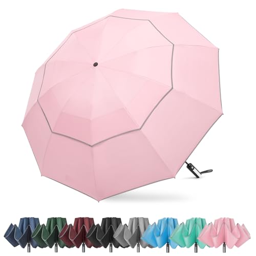 G4Free 137 cm vindtätt inverterat paraply med reflekterande rand, stort kompakt omvänt golfreseparaply för regn 10 spröt dubbel baldakin automatisk öppning (rosa)