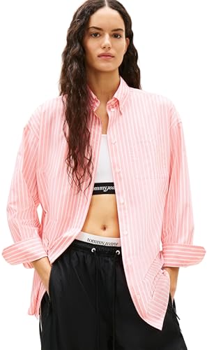 Tommy Jeans dam Tjw Ovs Poplin tröja DW0DW22218 L/S blusar, rosa (tropisk rodnad/randig), XL