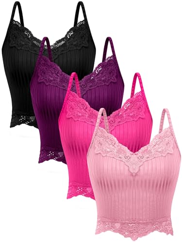 Bencailor 4 st spets Y2k linnen Fairy Grunge kläder Y2k magtoppar spets lappverk toppar cami ribbade stickade linnen för kvinnor, Svart, lila, rosenröd, rosa, M
