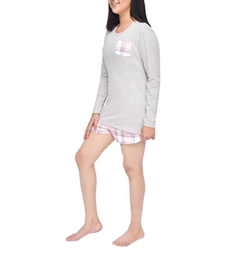 Sleepdown Dam pyjamas 2-delad kortärmad ficka t-shirt & rutig kort set casual myskläder nattkläder, grå rosa, XXL