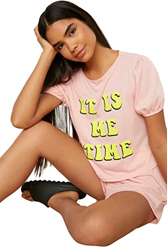 Trendyol Dam rosa slogan stickad pajamas kit pyjamas-set, ROSA, XL