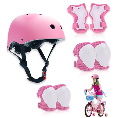 Cykelhjälm för barn med knäskydd armbågsskydd handledsskydd, justerbar hjälm för barn 5-14 år och ungdomar, sportskydd för skateboard, cykel, skoter (Rosa)