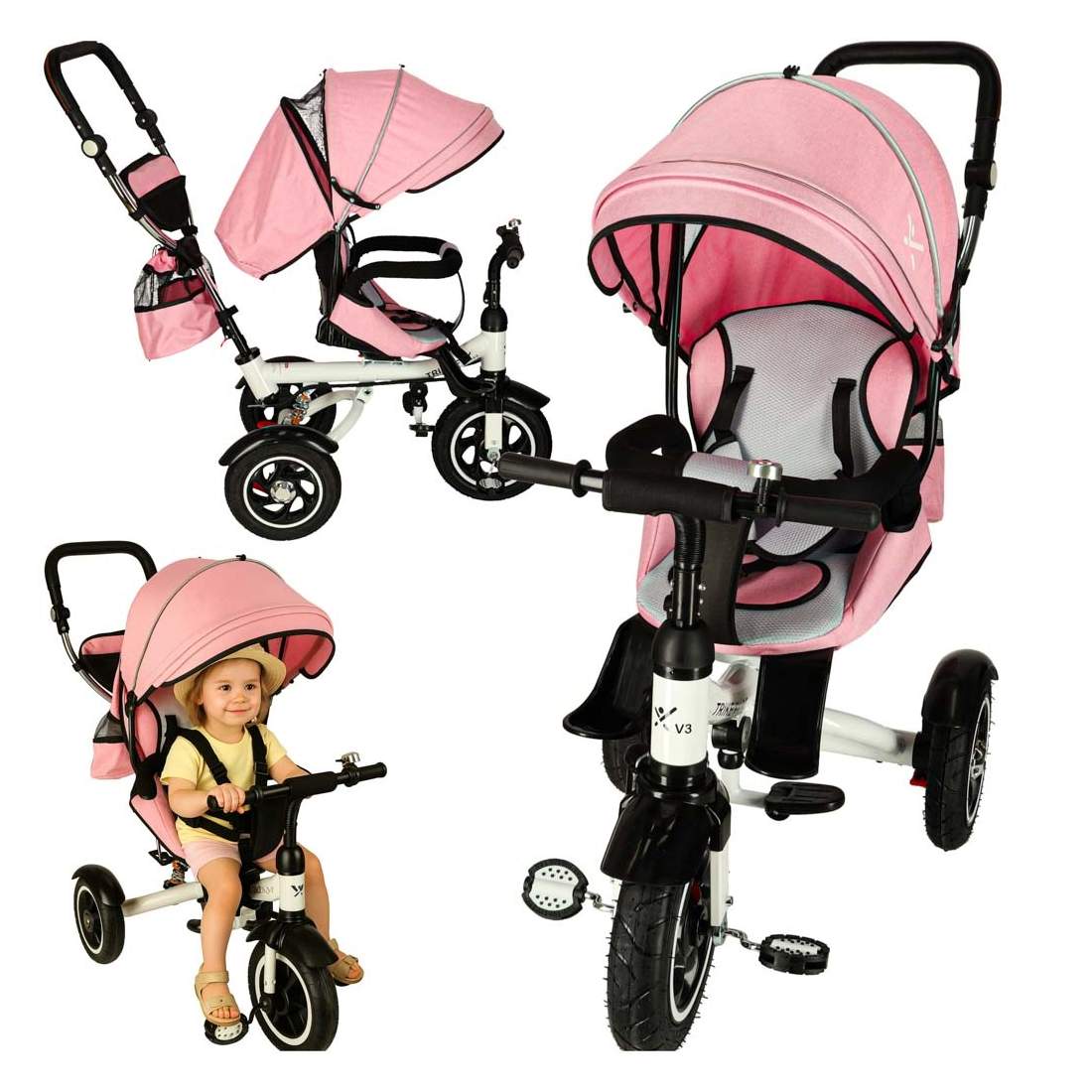Rosa trehjuling för barn med roterande säte och skjuthandtag