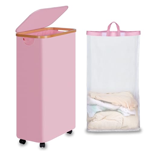 efluky Tvättkorg med rullar, 75 l, vikbar tvättkorg med lock, rosa smal tvättbehållare med bambumönster och avtagbar påse för sovrum, badrum, tvättstuga
