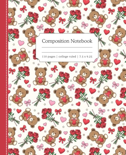 Composition Notebook College Ruled: Cute Valentines Day Bear & Roses Coquette Aesthetic Journal for Girls Teen Women
