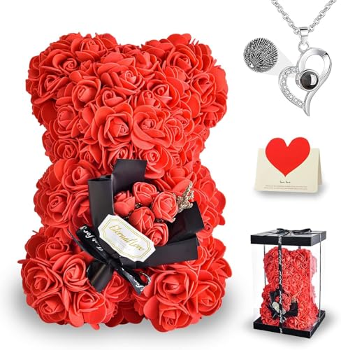 Rose Bear Alla hjärtans dag Blomsterpresenter för kvinnor med halsband, Söt Nalle Blomsterbjörn till sin fru Flickvän Mamma Syster Vänner, Födelsedagspresenter, Söta romantiska presenter och kort, Röd
