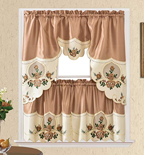 GOHD Rose Melody. 3pcs Kitchen Cafe Curtain Set. Swag and 24 inches Tiers Set for Small Windows. Nice Matching Color Rose Embroidery on Border and Inserted Organza. (Bronze)
