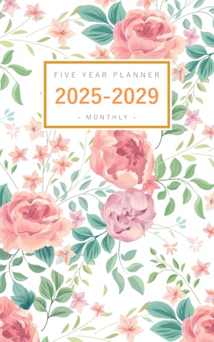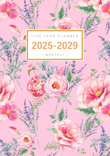 Five Year Planner 2025-2029: A5 Monthly Notebook Organizer Small | Watercolor Peony Rose Flower Design Pink