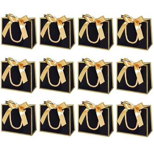 Små presentpåsar med handtag, mini presentpåsar liten tack-presentpåsar med rosett för bröllop baby party födelsedag del (svart, guld, 12 stycken)