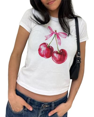 Kvinnors Y2K Baby T-shirts vardaglig smal passform rosett frukt grafiskt tryck magtoppar sommar rund hals mössa ärm gå ut toppar, C-körsbär, S
