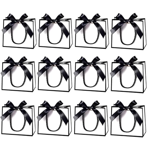 Små presentpåsar med handtag, mini presentpåsar liten tack-presentpåsar med rosett för bröllop baby party födelsedag del (vit, svart, 12 stycken)