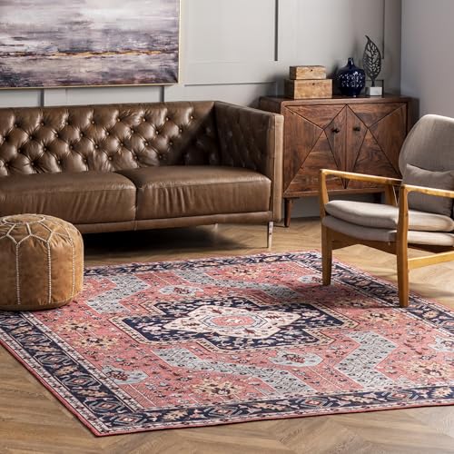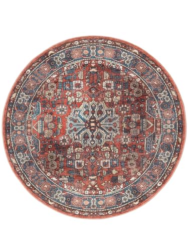 Safavieh traditionell matta optimal för högtrafikområden, maskintvättbar och halkbeständig, Tucson-kollektion, kort lugg, i rost och marinblått, 122 x 122 cm
