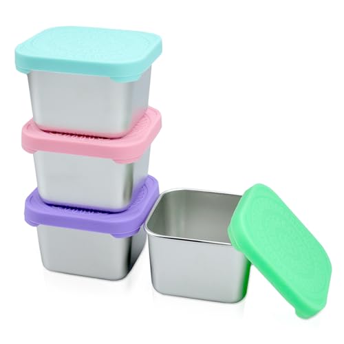 Hocadrv 4 stycken snackslådor rostfritt stål salladsdressing behållare såser behållare rostfritt stål burk liten med silikon lock snackbehållare läckagesäker återanvändbar bentolåda tillbehör (180 ml)