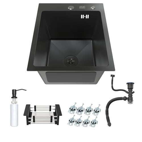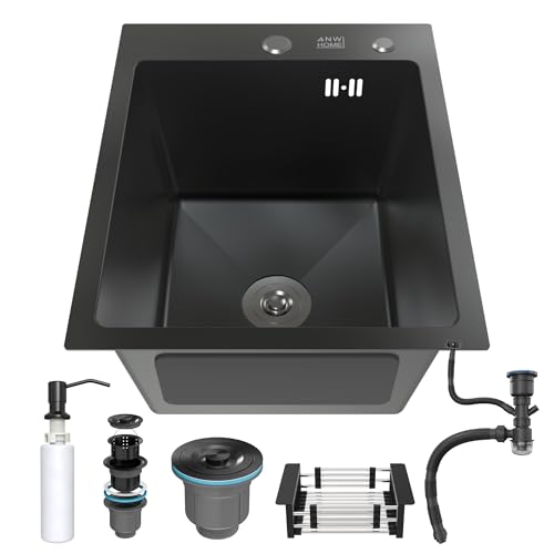 ANW HOME Svart köksbänk 40x50 cm med sifon, korgsil och 350 ml såpdispenser, 304 rostfritt stål köksbänk med 2 kranhål, rostfri bänk, matt svart bänk
