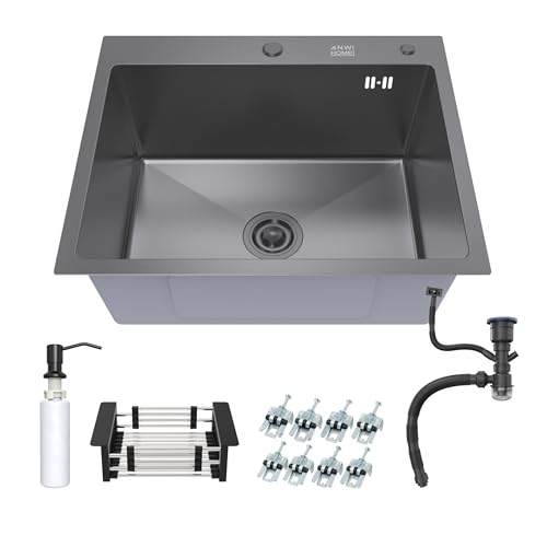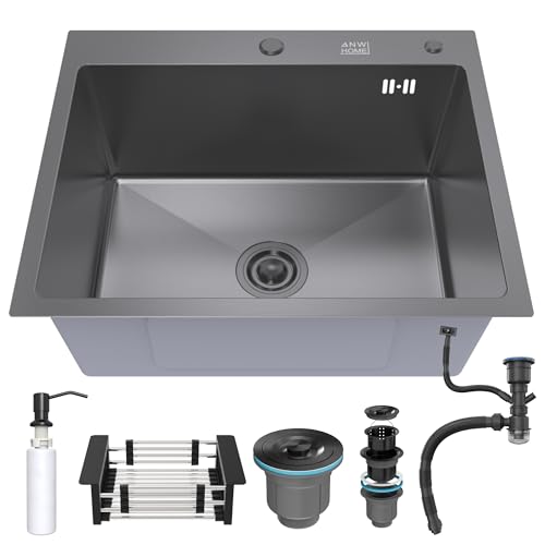 ANW HOME Köksbänk 60x45 cm med sifon, korgsil och 350 ml såpdispenser, 304 rostfritt stål köksbänk med 2 kranhål, rostfri bänk, Topmount Single Bowl-bänk