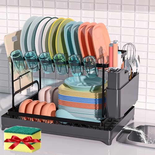 Rottogoon Stort disktorkställ, 2-nivåer rostfritt stål diskställ för köksbänk, hållbar diskdränering med dränering, redskapshållare för olika köksredskap, svart