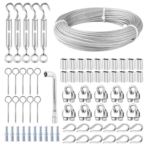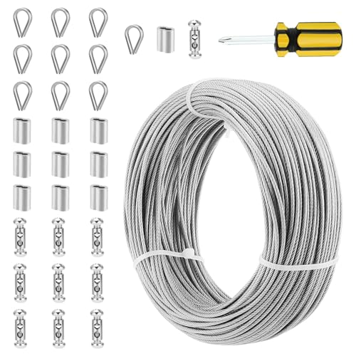 TooTaci Trädgårdstråd/kabelräcke kit inkluderar 30,5 m rostfritt stål vajer, 50 st krymphylsor i aluminium och 20 st fingerborgar i rostfritt stål för att hänga utomhuslampor, brädbeläggning, glob-ljus