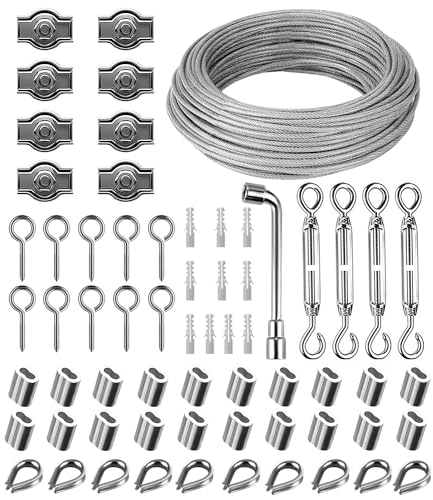 TooTaci Trädgårdstråd, 30 m/3 mm vajersats med M5 vridspänne trådspännare, vingögon för klätterväxter, 3 mm vajerklämmor, 3 mm rostfritt stål vajer metallkabel för staket, ljusslingor hängande