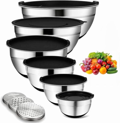 Beler 6 rostfria skålar med lock och rivjärn, salladsskålset för köket med silikonbotten, 6 krossningstillbehör