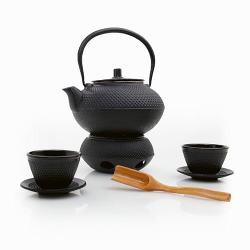 Lumaland 8-delat teset | 1,4 liters tekanna i gjutjärn, gjutjärnspanna, 2 tekoppar och 2 glasunderlägg, inklusive bambudoseringssked och rostfritt stål durkslag