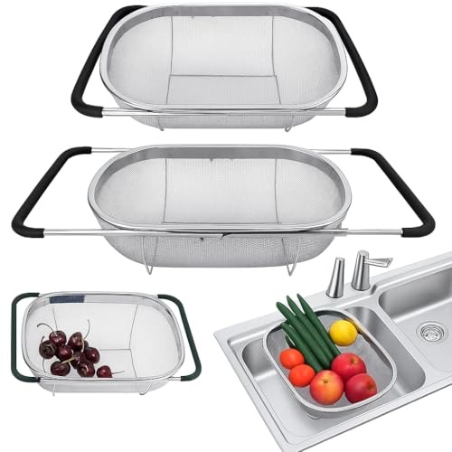 D L D Premiumkvalitet över diskbänken rostfritt stål ovalt durkslag med fint nät 6 kvart silkorg och expanderbara gummigrepp handtag – sil, dränering, skölj frukt, grönsaker (det nya)
